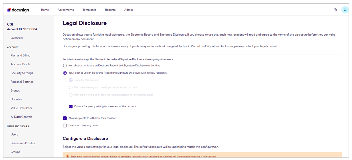 The legal disclosure text can be configured directly within the DocuSign portal. This disclosure is presented to all users and must be accepted before they can sign the transaction.