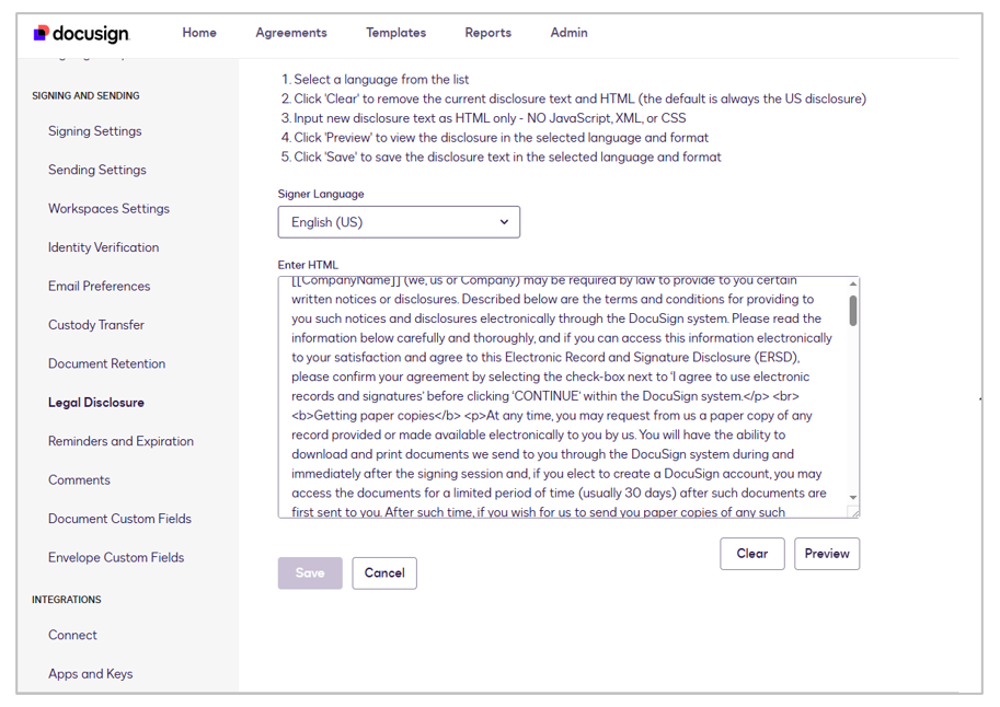The legal disclosure text can be configured directly within the DocuSign portal. This disclosure is presented to all users and must be accepted before they can sign the transaction.