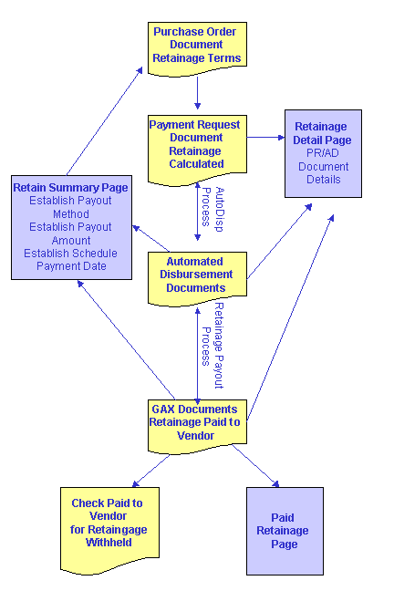Although the retainage terms are established on the Award document, the actual withholding of Retainage in Advantage Financial occurs in the Payment Request and Automated Disbursements processes. Based on the information entered on the Award document, payments are made to the contractor for the invoice amount, less retainage withheld. The retainage is recorded as a liability until liquidated (for example, paid out to vendor or third party or forfeited to the public entity).