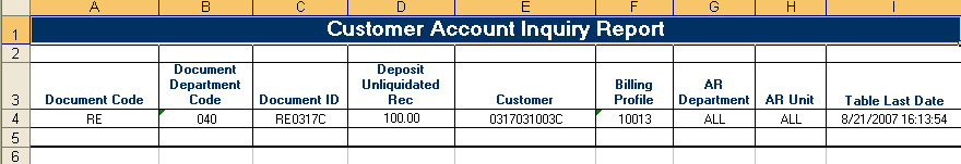 The download file contains nine columns as delivered: document code, document department code, document id, amount (labeled for customer account amount), customer, billing profile, AR department, AR unit, and a date and time stamp of the last update. The time and date stamp is from the most recent update to the customer account by the document. Shown below is a sample of a download: