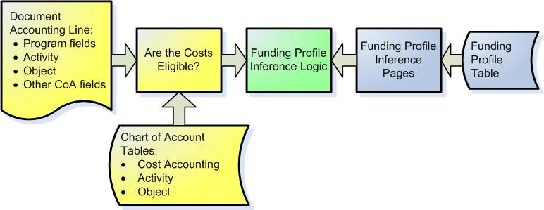 An eligible or ineligible Funding Profile is appropriately determined during document processing based on the evaluation of the Eligible for Reimbursable indicator on the Program, Program/Phase, Activity, Object and exception tables. For example, during a preliminary design phase of a project, an activity such as drafting preliminary designs can be considered an ineligible inactivity. Based on the final determination of the Eligible for Reimbursement indicator, the Funding Profile code is inferred based on the inference table setup. For example, you can setup the inference tables such that an enhanced Funding Profile is inferred for your Food Stamps fraud related program and a standard Funding Profile is inferred for your food stamp issuance program. In this example, the Federal government can reimburse 90% of eligible expenditures within the agreements of the enhanced Funding Profile, but only reimburse 50% of eligible expenditures in the standard profile.
