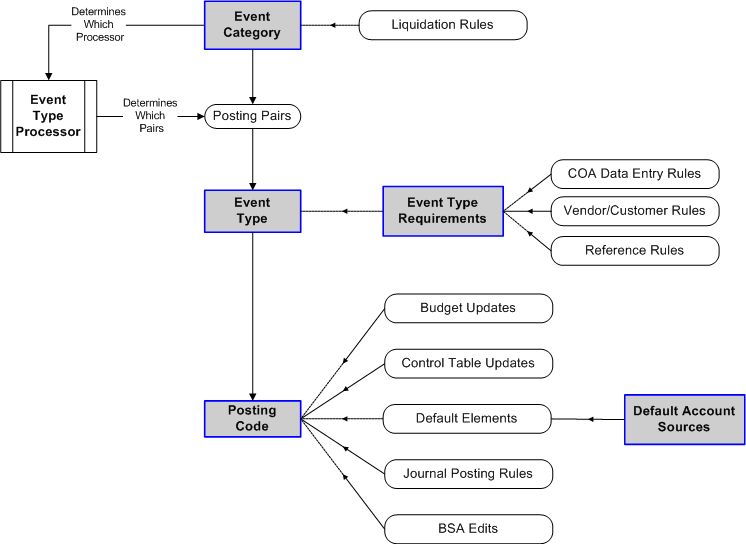 The following diagram shows the five main tables involved in the various accounting models along with the types of functionality that they provide. The approach to discussing the diagram will be in a top-down approach starting with the broad classification of an Event Category and ending with what is a Posting Code.