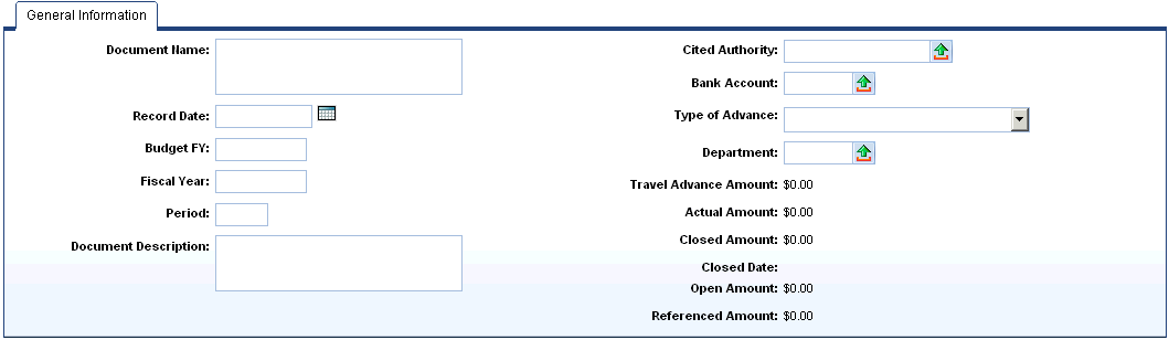 The TA Document Code contains most of the same fields and sections as the GAX Document Code, any differences are noted below. Please refer to the "General Accounting Expense/Expenditure (GAX)" section for screen shots and field definitions shared between the GAX and TA.