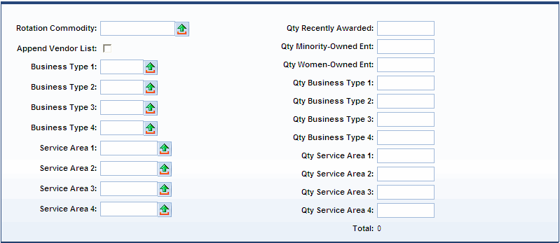 Vendor Rotation is used to create a sampling of vendors based on specific criteria. A buyer may be required by law to solicit a certain number of vendors. Some of those may need to be classified as Minority-Owned vendors or Women-owned. Some may need to be recently awarded vendors. The rotation works off of the commodity specified in the Rotation Commodity field. After your selections have been made you can choose the Load Vendor Rotation link, this will add the vendors to the Vendor List detail section. Buyers can designate the final vendor list as restricted, limiting responses to selected vendors only, by selecting the Vendor List Restricted Responses check box on the Header.